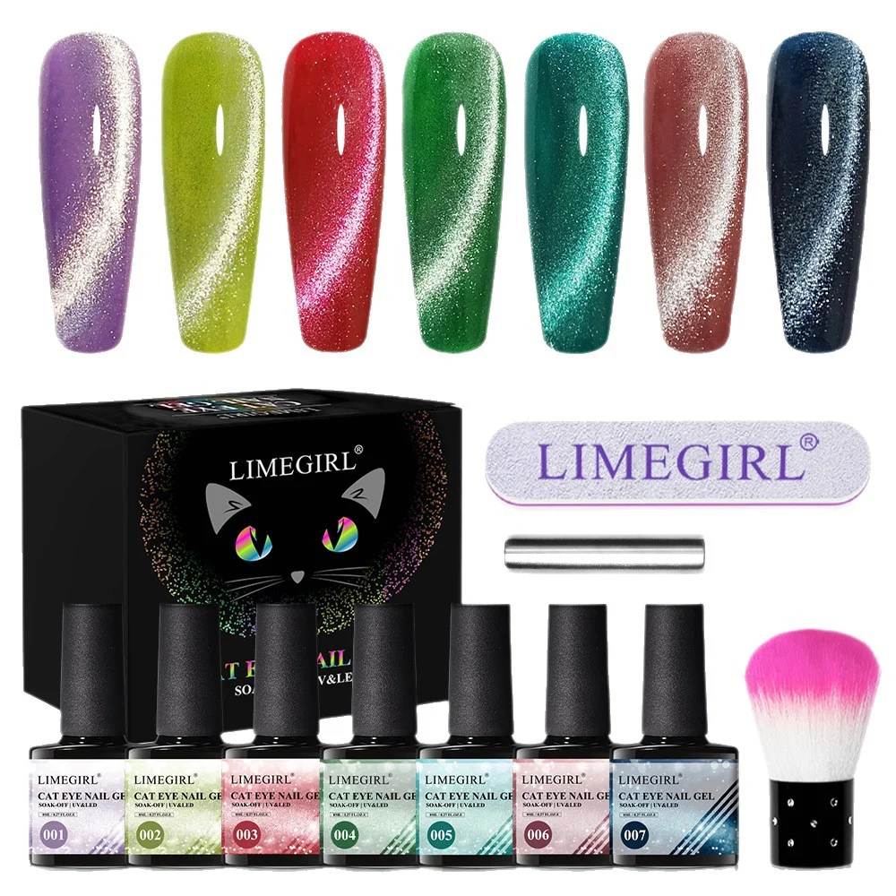 Cat Eye Gel Nail Polish Set, Limegirl 7 Colors Crystal Jade Neon Sparkle, UV LED Soak Off Manicure Kit