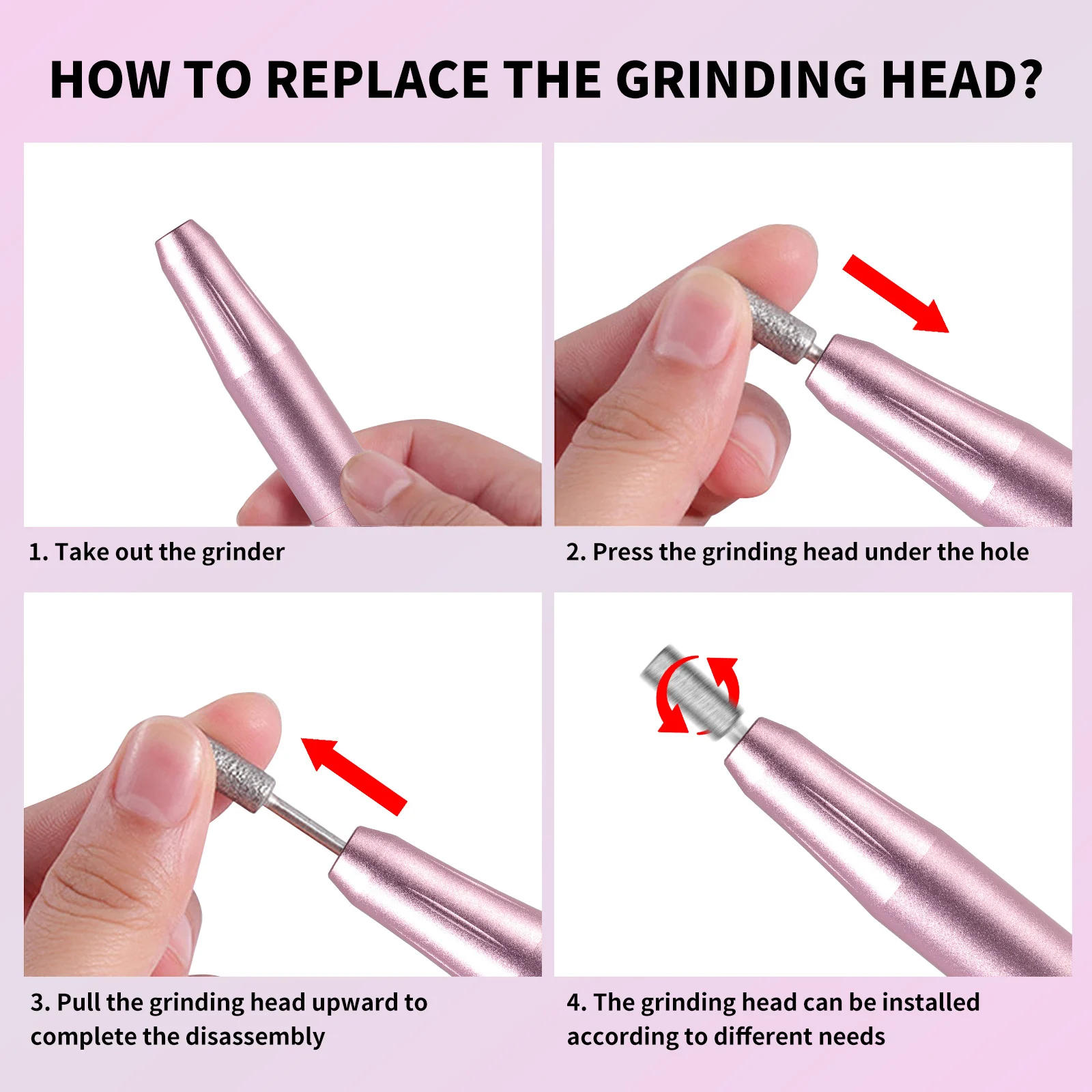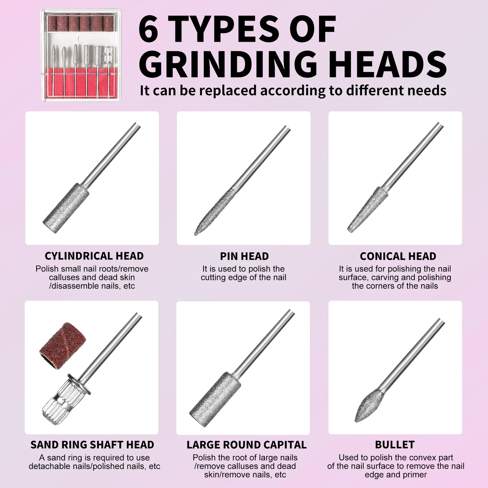 - 6 Interchangeable Heads: Includes cylindrical, pin, conical, and sand ring heads to cover all nail care needs from cuticle removal to surface buffing.