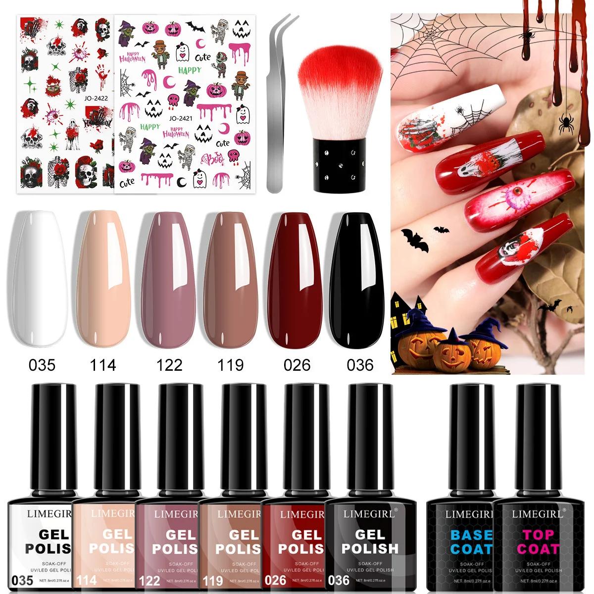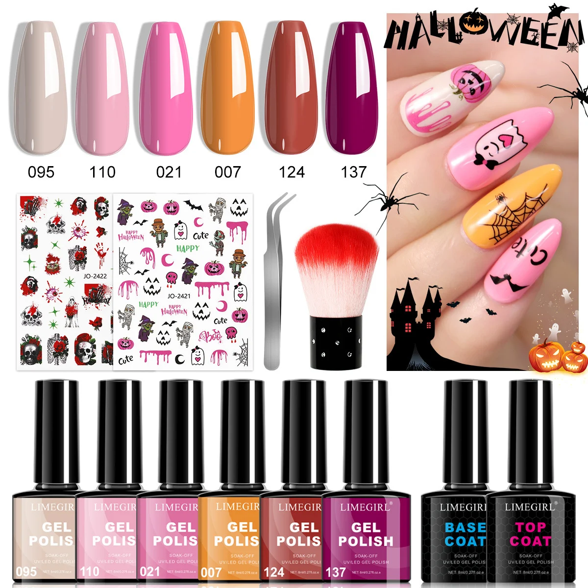 - Complete Halloween Set: Includes 6 selected gel colors (8ml each), base coat, top coat, tweezers, dust brush, and themed nail stickers.