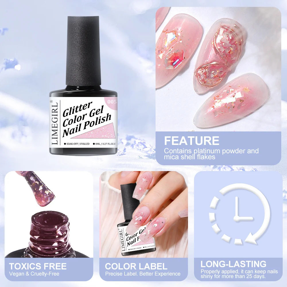 Elevate your nail game with the Limegirl Mica Shell Gel Polish Set. This collection captures the essence of summer with its unique blend of platinum powder and genuine mica shell flakes, creating a translucent, high-gloss finish that mimics the iridescent beauty of the ocean. Whether you’re looking for a full-color shimmer or delicate nail art accents, these gels provide a professional salon-quality look that lasts.