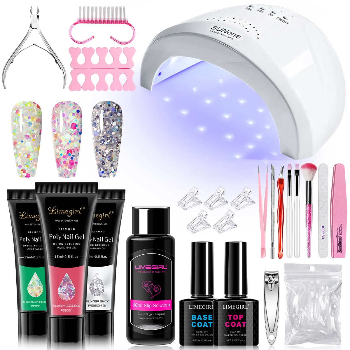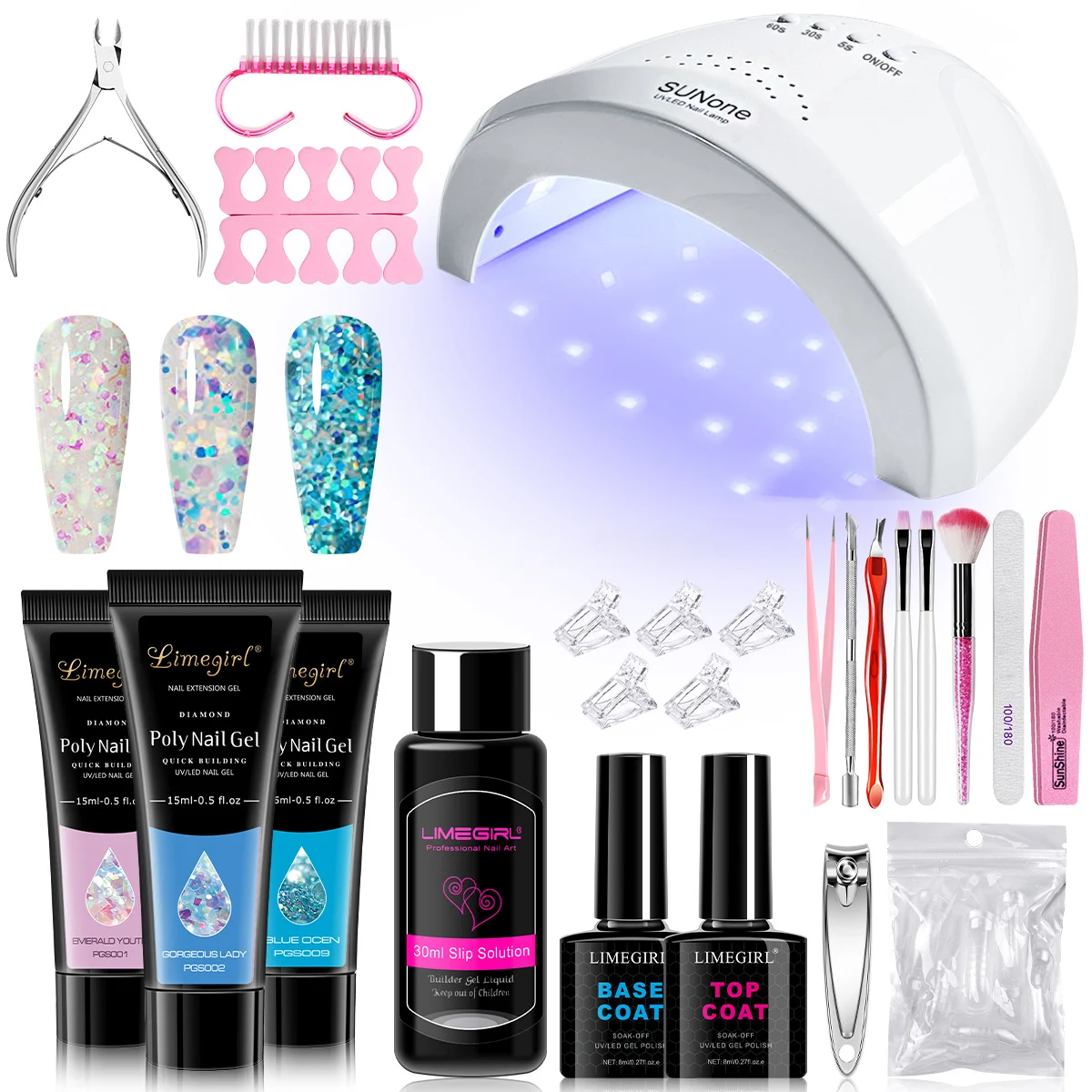 - All-In-One Starter Kit: Includes 3 colors of extension gel, a high-power UV/LED lamp, slip solution, base and top coats, and essential manicure tools.