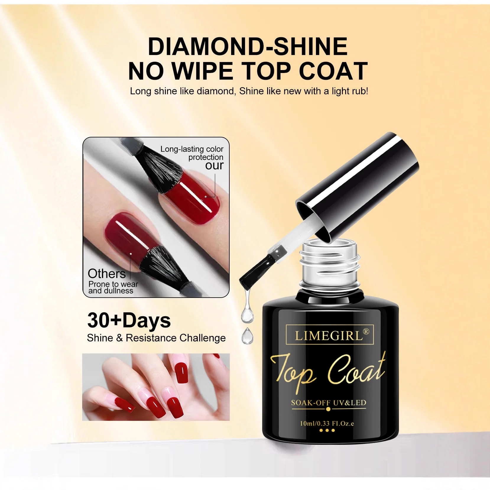 - Top Coat: Apply the No-Wipe Top Coat for a diamond shine and cure for 90-120 seconds.